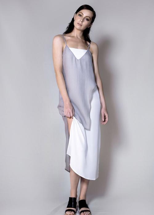 Midi length slip dress featuring double silk georgette with a washed linen overlay highlighting details of skirt side slits. Finished with single straps and a straight neckline featuring a silk peekaboo triangle contrast. Luxe, airy and fluid feel. Style this sleek dress with slip sandals or pumps, or pair with our Tuck It Tunic Top for a layered ensemble